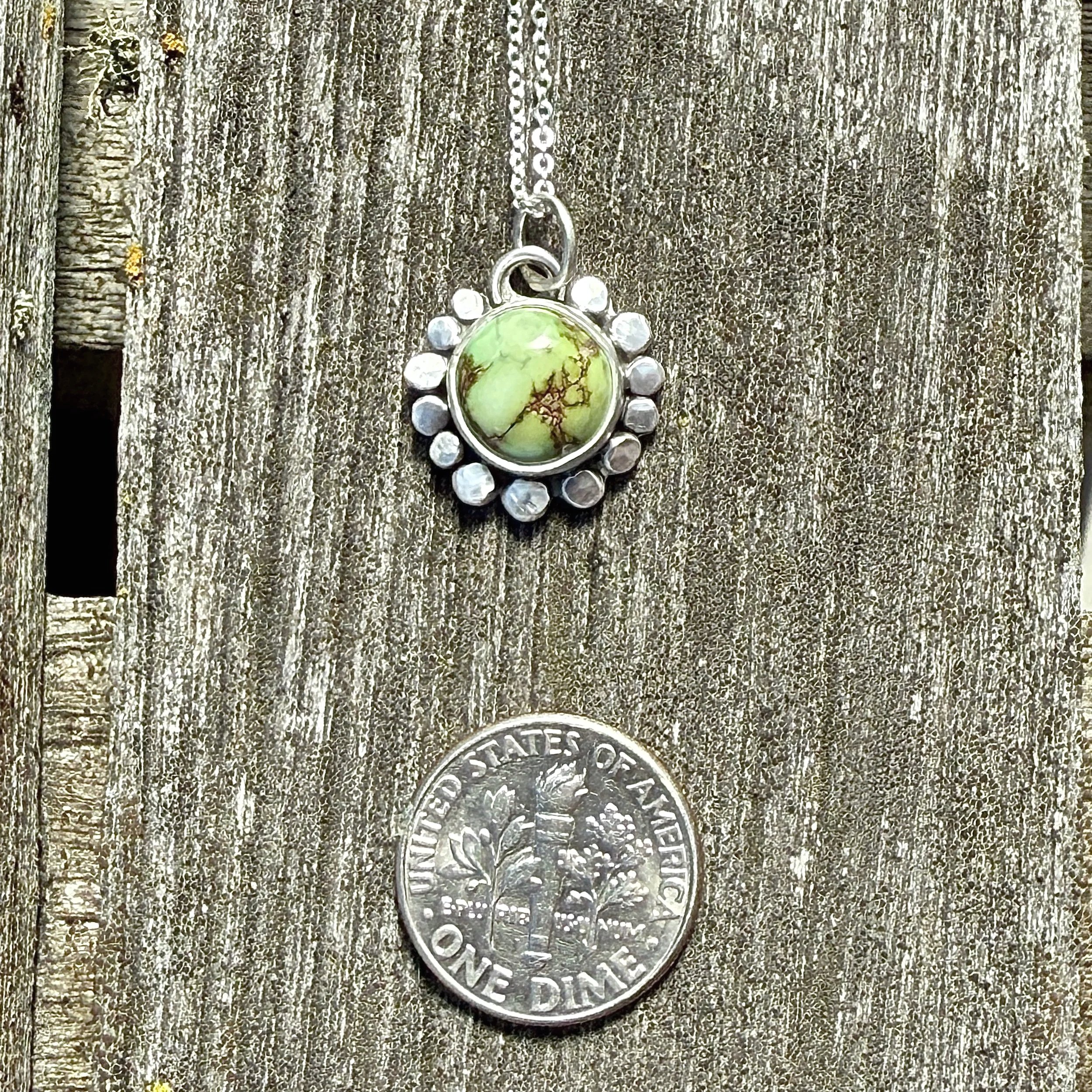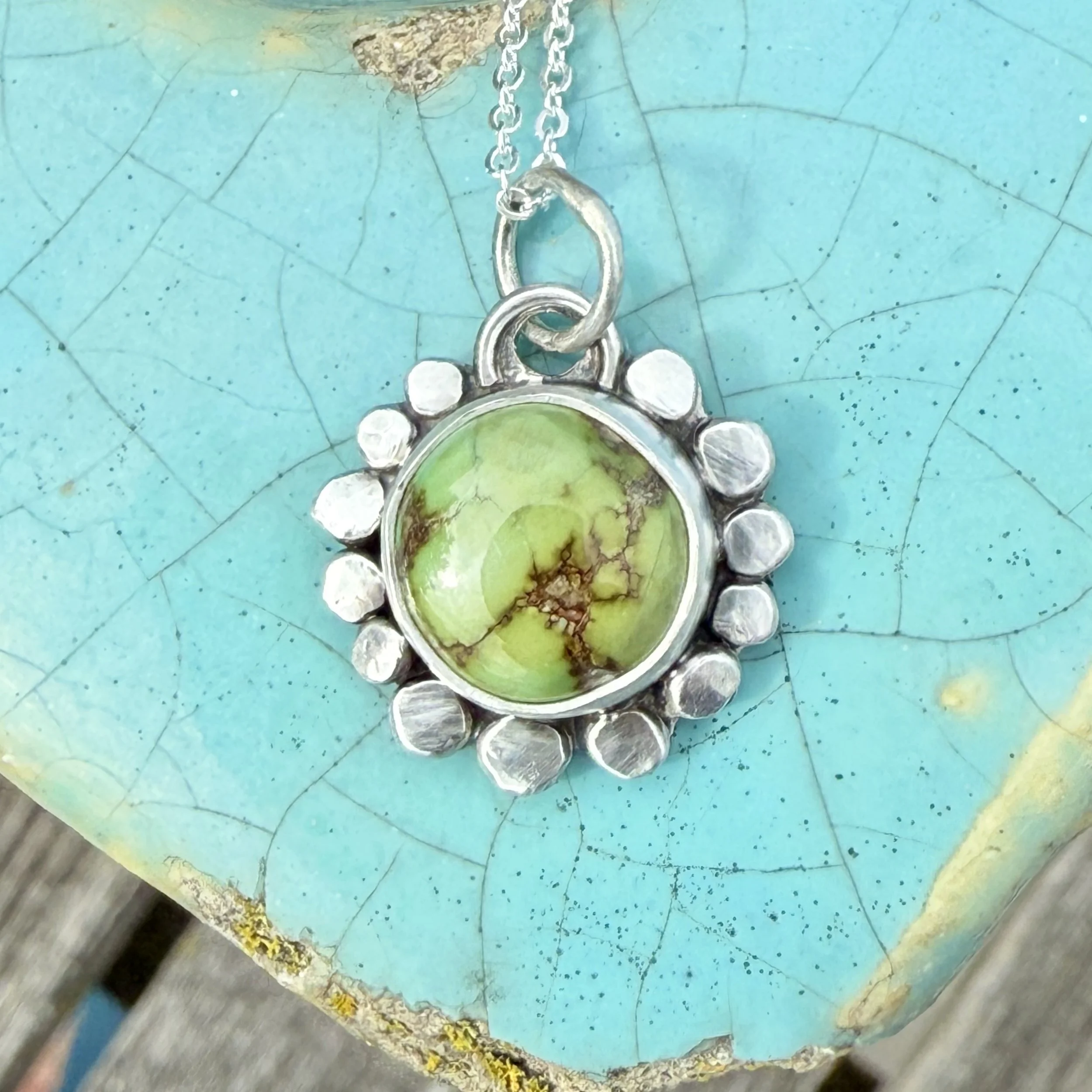 Cute little Sonoran Gold turquoise with some hammered silver circles. It was an experiment, and I like it—like a tiny flower.